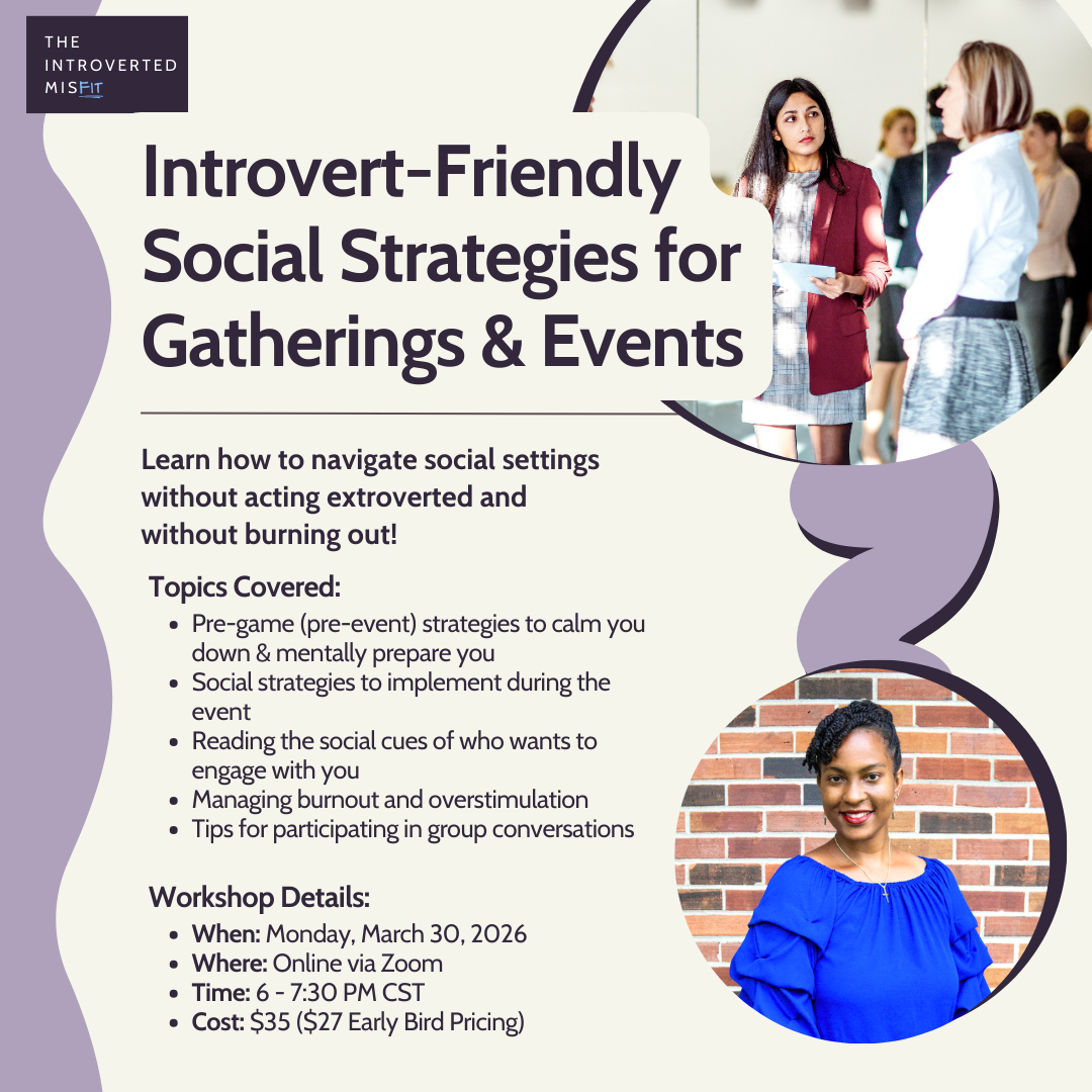 This workshop is for introverts who find navigating social events to be tricky, nerve-racking, and overall not worth the stress. Whether you’re shy, socially anxious, socially awkward or on the spectrum with low support needs like myself (or a combination of those), you will walk away knowing some practical social strategies that you can use at your next social event!